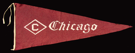 Description:Early "Chicago" souvenir pennant c.1910-20. Oversized 36" long red pennant displays "C" decoration at the left side with "Chicago" lettering in script across the body. The pennant retains its original tassels and remains in fine overall condition for its age with a few areas of light age toning/fading/soiling. Although not definitive, the color schematic and decor suggest White Sox affiliation: VG-EX