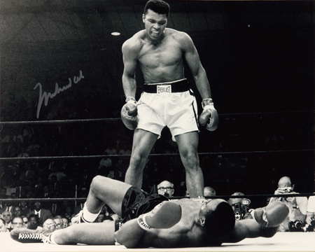 Description:Muhammad Ali autographed photograph. 16"x20" Black and white photograph has been signed on the front, "Muhammad Ali." Silver paint pen signature rates 9 out of 10. Double matted and framed to 22"x26.5" overall. Includes LOA from JSA and additional COA: NM