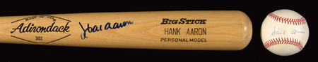 Description:Hank Aaron autographed bat and baseball (2). Includes very lightly toned Rawlings Official National League W.White baseball signed on the sweetspot in blue ink and Adirondack 302 model baseball bat signed on the barrel in blue marker. Signatures rate 8 to 9 out of 10. Includes auction LOA from JSA and letter of provenance from Curt Schilling: EX/MT-NM