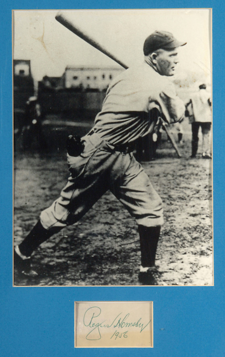Description:Rogers Hornsby autographed signature. 2"x3.5" (Visible area) paper slip has been signed on the front, "Rogers Hornsby 1956." Ink signature rates 8/9 out of 10. Paper exhibits light toning. Framed to 14"x18" overall with black and white photograph. Includes auction LOA from JSA and letter of provenance from Curt Schilling: EX/MT