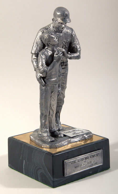 Description:Whitey Ford autographed "The Legend Lives" pewter statue by Michael Ricker. Substantive cast pewter Ford figure offering advice to a young fan. Inset metal placard has been signed, "Whitey Ford" in black marker rating 8 out of 10. Mounted to marble base and stands 9.5" tall overall with 4.5" square footprint. Numbered 10/500. Includes auction LOA from JSA: EX/MT-NM