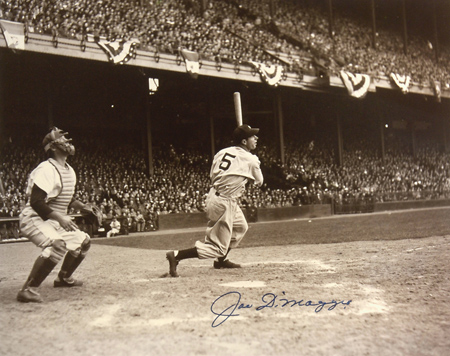 Description:Joe DiMaggio autographed photograph. Large format sepia toned photograph has been signed on the front, "Joe DiMaggio." Blue marker signature rates 9 out of 10. Framed to 25.5"x29.5" overall. Includes auction LOA from JSA and letter of provenance from Curt Schilling: EX/MT-NM