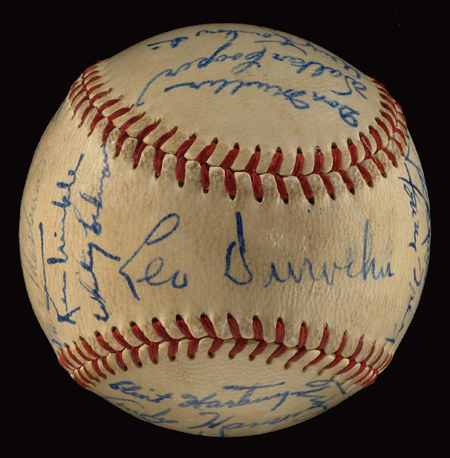 Description:1948 New York Giants team signed baseball. Spalding F.Frick ONL ball has been signed by (25) including Durocher, T.Jackson, Mize, Cooper, Thomson, Rigney, and others. Fountain pen signatures rate 7 to 9 out of 10 (avg. 8). Ball displays a very light even tone. Small handwritten "1948 Giants" near League stampings. Includes auction LOA from JSA and letter of provenance from the family: Ball EX/MT, Sigs. EX-NM
