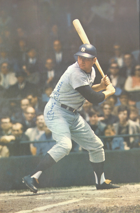 Description:Mickey Mantle autographed Sports Illustrated Poster. Desirable original poster issued in 1968 has been signed across the front, "Mickey Mantle." The blue marker signature rates 8/9 out of 10. Measures approximately 2 feet by 3 feet and makes for an impressive and highly visual display. Includes auction LOA from JSA and letter of provenance from Curt Schilling: EX/MT