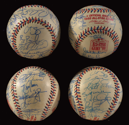 Description:Lot of (4) 1999 National League All-Star team signed baseballs. Rawlings red and blue stitch Official 1999 All-Star Game balls, each signed by (32) to (34) including McGwire, Sosa, Schilling, Johnson, Gwynn, Bagwell, and Piazza. Ink signatures rate 7/8 to 9 out of 10. Mostly minor scattered smudging and age toning throughout. Includes auction LOA from JSA and letter of provenance from Curt Schilling: EX-EX/MT