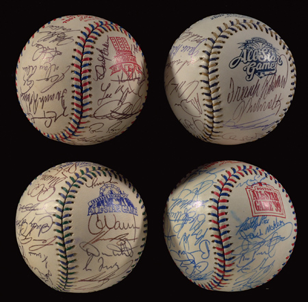 Description:1997-2002 National League All-Star team signed baseballs (4). Includes Rawlings B.Selig OML 1997 All-Star Game ball signed by (34) including Bonds, F.Robinson, Grace, Schilling, Piazza, and Maddux; Rawlings B.Selig OML 1998 All-Star Game ball signed by (28) including McGwire, Sosa, Gwynn, Piazza, Schilling, Bonds, Biggio, and Maddux; Rawlings B.Selig OML 1999 All-Star Game ball signed by (33) including McGwire, Schilling, Bagwell, Piazza, and Gwynn; and Rawlings B.Selig OML 2002 All-Star Game ball signed by (24) including Schilling, Smoltz, F.Robinson, Guerrero, and Rollins. Ink signatures rate 7 to 9 out of 10, generally averaging 8. Varying degrees of very minor fading, ink transfer, and toning mentioned for accuracy but not largely affecting the balls. Includes auction LOA from JSA and letter of provenance from Curt Schilling: EX/MT