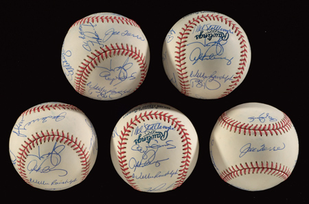 Description:Lot of (5) 2001 American League All-Star partial team signed baseballs. Rawlings B.Selig OML baseballs, each signed by (13) to (17) players including Torre, Clemens, A-Rod (4 out of 5), Pettitte, Giambi, B.Williams, and others (Note: not all have identical rosters, some players may be present on 1 or 2 balls only). Ink signatures rate 7/9 to 9 out of 10 with mostly very minor scattered ink transfer or in isolated cases smudging. Individual MLB Authentication holograms affixed but do not appear in online database. Includes auction LOA from JSA and letter of provenance from Curt Schilling: EX/MT-NM