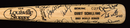 Description:1993 Curt Schilling professional model World Series bat autographed by Phillies team. Louisville Slugger 125 model bat with "Curt Schilling 1993 World Series" and model number "C271" burned in barrel end measures 34" long and weighs 31.2oz. Signed by approximately (31) members of the National League Champion Philadelphia Phillies including Schilling, Daulton, Bowa, Kruk, Dykstra, Morandini, and others. Black marker signatures rate 8/9 out of 10. A hint of incidental surface wear with no evident usage wear. Includes auction LOA from JSA and letter of provenance from Curt Schilling: EX/MT-NM