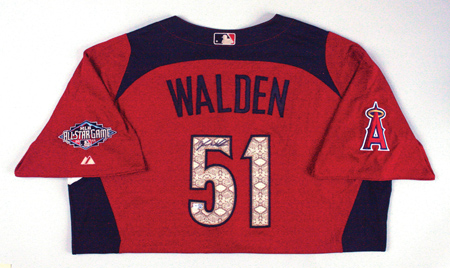 Description:2011 Jordan Walden autographed American League All-Star Game Workout Day/Home Run Derby Jersey. Maroon polyester jersey has "American" team name lettered across the front and "Walden" on back along with number "51."-Los Angeles Angels logo patch is affixed to the right sleeve with MLB All-Star Game logo patch on the left. Majestic label sewn on front tail and "Cool Base" and size 52 flag tags are affixed to the seam. Proper 0078 wash tag on interior. Signed on the back number in black marker rating 9 out of 10 with affixed MLB hologram FJ744216. Includes auction LOA from JSA: NM