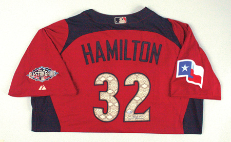 Description:2011 Josh Hamilton autographed American League All-Star Game Workout Day/Home Run Derby Jersey. Maroon polyester jersey has "American" team name lettered across the front and "Hamilton" on back along with number "32."-Texas Rangers logo patch is affixed to the right sleeve with MLB All-Star Game logo patch on the left. Majestic label sewn on front tail and "Cool Base" and size 52 flag tags are affixed to the seam. Proper 0078 wash tag on interior. Signed on the back number in black marker rating 9 out of 10 with affixed MLB hologram FJ744214. Includes auction LOA from JSA: NM
