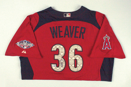 Description:2011 Jered Weaver autographed American League All-Star Game Workout Day/Home Run Derby Jersey. Maroon polyester jersey has "American" team name lettered across the front and "Weaver" on back along with number "36."-Los Angeles Angels logo patch is affixed to the right sleeve with MLB All-Star Game logo patch on the left. Majestic label sewn on front tail and "Cool Base" and size 50 flag tags are affixed to the seam. Proper 0078 wash tag on interior. Signed on the back number in black marker rating 9 out of 10 with affixed MLB hologram FJ744206. Includes auction LOA from JSA: NM