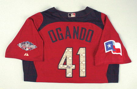 Description:2011 Alexi Ogando autographed American League All-Star Game Workout Day/Home Run Derby Jersey. Maroon polyester jersey has "American" team name lettered across the front and "Ogando" on back along with number "41."-Texas Rangers logo patch is affixed to the right sleeve with MLB All-Star Game logo patch on the left. Majestic label sewn on front tail and "Cool Base" and size 48 flag tags are affixed to the seam. Proper 0078 wash tag on interior. Signed on the back number in black marker rating 9 out of 10 with affixed MLB hologram FJ744220. Includes auction LOA from JSA: NM