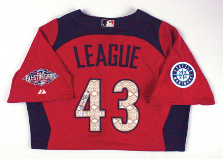 Description:2011 Brandon League autographed American League All-Star Game Workout Day/Home Run Derby Jersey. Maroon polyester jersey has "American" team name lettered across the front and "League" on back along with number "43."-Seattle Mariners logo patch is affixed to the right sleeve with MLB All-Star Game logo patch on the left. Majestic label sewn on front tail and "Cool Base" and size 46 flag tags are affixed to the seam. Proper 0078 wash tag on interior. Signed on the back number in black marker rating 9 out of 10 with affixed MLB hologram FJ744229. Includes auction LOA from JSA: NM
