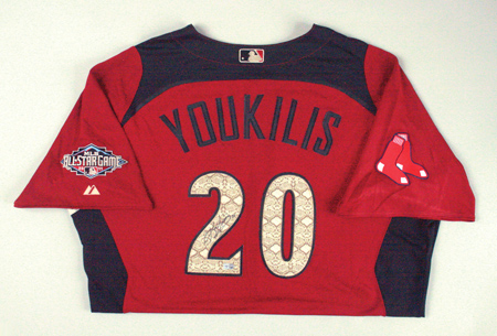 Description:2011 Kevin Youkilis autographed American League All-Star Game Workout Day/Home Run Derby Jersey. Maroon polyester jersey has "American" team name lettered across the front and "Youkilis" on back along with number "20."-Boston Red Sox logo patch is affixed to the right sleeve with MLB All-Star Game logo patch on the left. Majestic label sewn on front tail and "Cool Base" and size 50 flag tags are affixed to the seam. Proper 0078 wash tag on interior. Signed on the back number in black marker rating 9 out of 10 with affixed MLB hologram FJ744213. Includes auction LOA from JSA: NM