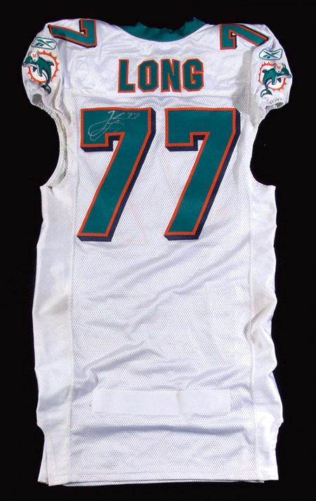 Description:Jake Long autographed game worn Miami Dolphins jersey. Game jersey from their October 23, 2011 game vs. the Denver Broncos. White pullover jersey with number "77" sewn on the front, back, and both shoulders. "LONG" nameplate is sewn across the back. "10-44" strip tag is sewn in the collar, likely indicating that the jersey was continuing to be used from the previous year. His "C" captain patch is sewn to the right of the collar. Reebok NFL Equipment tagging is sewn on the front tail, with 6"L.B. and 44 flag tags. The jersey is customized with Velcro on the front and back tails. Long signed the jersey in silver paint pen. Signature rates 8 out of 10. The jersey exhibits very strong usage wear including areas of soiling and staining. Includes NFL Auction COA from PSA/DNA (serial #ed sticker is affixed): EX