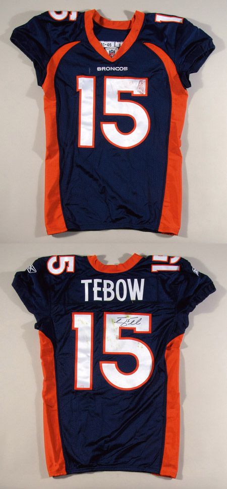 Description:October 23, 2011 Tim Tebow autographed game worn Denver Broncos jersey. Exceptional game jersey worn by Tebow during his first start of his magical 2011 season in which he captured the attention of football fans across the nation with his passionate style of play. Navy blue pullover jersey with number "15" sewn on the front, back, and both shoulders. "TEBOW" nameplate is sewn across the back. Proper "11-46" "A" strip tag is sewn in the collar, denoting year and size. Tebow signed the jersey in black marker. Signature rates 8 out of 10. The jersey exhibits very strong usage wear including areas of heavy soiling and grass staining mainly visible on the uniform numbers. Includes NFL Auction COA from PSA/DNA (serial #ed sticker is affixed): EX
