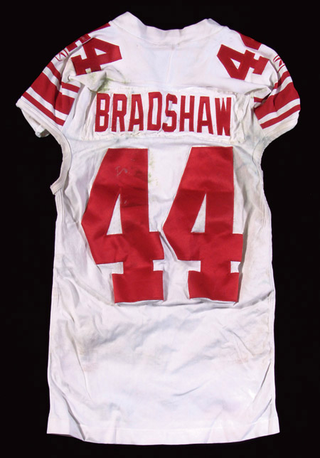 Description:2011 Ahmad Bradshaw game worn New York Giants jersey. Game jersey from their October 2, 2011 game vs. the Arizona Cardinals in which Bradshaw had 50 total yards and a touchdown. White pullover jersey with number "44" sewn on the front, back, and both shoulders. "BRADSHAW" nameplate is sewn across the back. Reebok maker markings are imprinted on the inner collar. The jersey exhibits very strong usage wear including areas of heavy soiling and grass staining. Includes NFL Auction COA from PSA/DNA (serial #ed sticker is affixed): EX