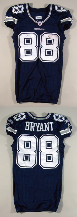 Description:2011 Dez Bryant game worn Dallas Cowboys jersey. Game jersey from their October 16, 2011 game vs. the New England Patriots in which Bryant had 4 catches for 78 yards. Navy blue pullover jersey with number "88" sewn on the front, back, and both shoulders. "BRYANT" nameplate is sewn across the back. Proper "11-46" strip tag is sewn in the collar, denoting the year and size. The jersey exhibits very strong usage wear including areas of heavy soiling and staining mainly visible on the uniform numbers. Includes NFL Auction COA from PSA/DNA (serial #ed sticker is affixed): EX