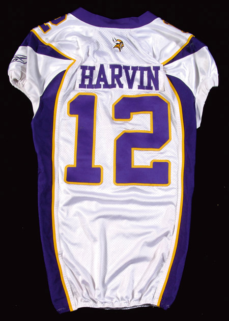 Description:October 11, 2010 Percy Harvin game used Minnesota Vikings road jersey (NFL Auctions - PSA/DNA). White mesh pull over jersey worn by Harvin during 2010 home game vs.. the New York Jets. Player number "12" sewn on front and back. "Harvin" nameplate on back. Vikings 50 year anniversary patch on chest. In the collar are "10-44" and "O" strips tags in collar. Reebok logos embroidered on either sleeve and "NFL Equipment" shield logo at base of neck. Custom elastic at bottom. Exceptional usage wear throughout. Authenticated by PSA/DNA as part of the Official Authentic NFL program and includes their certificate: EX