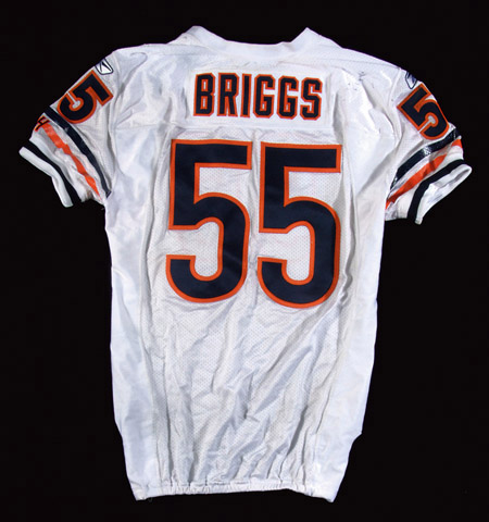 Description:Lance Briggs game worn Chicago Bears jersey. Game jersey worn by Briggs during the 2011 season. White pullover jersey with number "55" sewn on the front, back, and both shoulders. "BRIGGS" nameplate is sewn across the back. Proper "11-50" strip tag is sewn in the collar, denoting year and size. The jersey exhibits very strong usage wear including eye black stains around the shoulder area. Includes NFL Auction COA from PSA/DNA (serial #ed sticker is affixed): EX