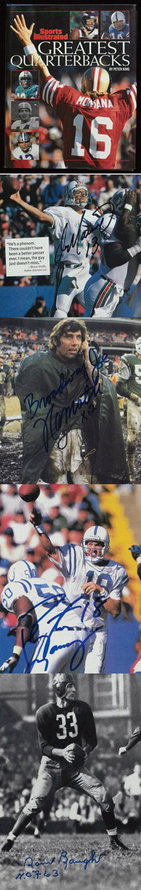 Description:Sports Illustrated "Greatest Quarterbacks" coffee table book with (82) signatures (43 different Hall of Fame/notable players). Hardcover book chronicling the greatest quarterbacks of all-time has been signed throughout the interior by (43) different players with several having signed more than once with the result being (82) total autographs. Multiples are noted following name. Includes Aikman, S.Baugh (3), Bleir, Bradshaw, Brees, Cunningham, Elway (3), Favre (4), Fouts (3), Griese, F.Harris, E.Jones, Jurgenson (3), J.Kelly (4), A.Manning, P.Manning, Marino (4), Montana (4), Moon, Namath (3), Plunkett, Sims (4), Stabler, Starr, Staubach (6), Tarkenton (5), Tittle, Van Brocklin, S.Young (4), and others. Majority of signers have added HOF and/or other career related inscriptions. Marker signatures rate uniformly strong 8 to 9 out of 10 with (2) or (3) minimally affected by ink transfer. Touch of light wear to book/dustjacket. Nearly impossible project to duplicate given the dollar figures currently charged for autographs and one of the most aggressive autographed book projects we have seen undertaken: EX/MT-NM