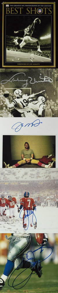 Description:"Best Shots" coffee table book with (47) signatures (37 different mostly Hall of Famers). Hardcover book chronicling "The Greatest NFL Photography of the Century" has been signed throughout the interior by (37) different players with several having signed more than once with the result being (47) total autographs. Multiples noted following name. Includes J.Brown, Bednarik, Butkeu, Csonka, R.Cunningham (2), T.Davis, Dickerson, Elway (2), Gregg, Griese (2), M.Irvin, Joiner, Lambert, Namath (2), J.Rice (2), B.Sanders, E.Smith, Stabler, Starr, Staubach, Swann (2), Tittle, Unitas, and S.Young (4). Many have added career or image related inscriptions. Marker signatures rate uniformly strong 8 to 9 out of 10. Touch of light wear to book/dustjacket. Nearly impossible project to duplicate given the dollar figures currently charged for autographs: EX/MT-NM
