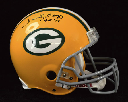 Description:Forrest Gregg autographed and inscribed Green Bay Packers helmet. Full size Riddell Pro Line vs R4 Packers helmet signed by Gregg in black marker with "HOF 77" inscription. Signature rates 9 out of 10. Includes NFL Auction COA from PSA/DNA (serial #ed sticker is affixed): NM