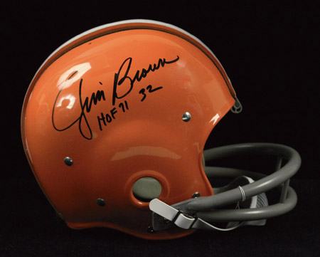 Description:Jim Brown autographed Cleveland Browns throwback helmet. Full size Riddell 1960s style RK2 Suspension football helmet (size 7 3/8) has been signed on the side in black marker with "HOF 71" and "32" inscriptions. Signature rates 9/10 out of 10. Includes COA from JSA: EX/MT-NM
