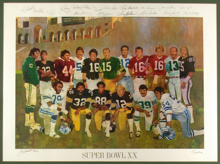 Description:Bernie Fuchs "Super Bowl XX" limited edition lithograph autographed by Joe Namath. Scarce art print on archival rag paper done in 1986 to commemorate the 20th Anniversary of the Super Bowl. Depicts each of the (17) players to have been previously named MVP with their facsimile signatures in gold along the upper border. It is believed that each player signed (20) hand numbered prints (out of 500 produced) with (3) signing (40) as they had been named MVP twice. This example, numbered 83/500, has been signed "Joe Namath" in gold paint pen within the lower border rating 9 out of 10. Also signed by the artist and includes the original Certificate of Authenticity. Framed to 37.25"x40.25" overall and includes auction LOA from JSA: EX/MT-NM