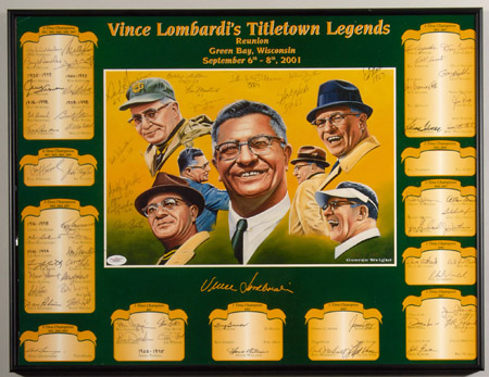 Description:2001 "Titletown Legends" print autographed by (68) Packers Hall of Famers and Star players. Framed 18"x24" limited edition print has been signed throughout by a host of Legendary Green Bay figures, all of whom were members of or Coaches on Vince Lombardi's Championship teams. Notables include Starr, Wood, Kramer, Gregg, Hornung, Taylor, Ringo, McGee, Dowler, Jeter, Agajian, Fleming, Anderson, and others. Black ink signatures rate uniformly strong 8/9 out of 10. Exceptionally complete example with nearly all possible signers present. Includes full LOA from JSA: NM