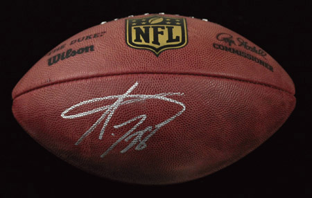 Adrian Peterson autographed NFL football. Wilson "The Duke" R.Goodell NFL football signed by Peterson in silver paint pen. Signature rates 8/9 out of 10. Includes NFL Auction COA from PSA/DNA (serial #ed sticker is affixed): NM
