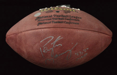Description:Peyton Manning autographed football with MVP inscription. Wilson P.Tagliabue Official NFL football has been signed, Peyton Manning with "03, 04 MVP" inscription. Silver paint pen signature rates 8 out of 10. Includes auction LOA from JSA and COA from Schwartz Sports: NM