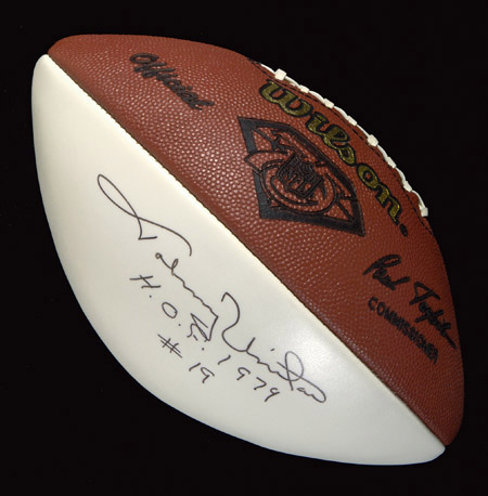 Description:Johnny Unitas autographed football. Wilson P.Tagliabue white panel NFL 75th Anniversary logo football has been signed, "Johnny Unitas" with added "H.O.F. 1979" and "#19" inscriptions. Black marker signature rates 9 out of 10. Includes full LOA from JSA: NM