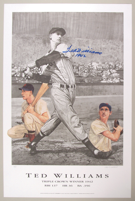 Description:Ted Williams autographed "Triple Crown Winner" artist's proof lithograph. Large format 23"x35" composite artwork lithograph titled within the lower border and listing Williams' 1942 season statistics. Signed in blue marker, "Ted Williams" with "1942" inscription rating 9 out of 10. Also signed by the artist Lewis Watkins and hand numbered "A/P" denoting artist's proof. Hint of light wear entirely confined to the extreme edges. Includes auction LOA from JSA: EX/MT-NM