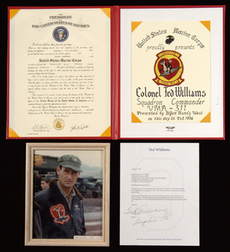 Description:Ted Williams United States Marine Corps presentational citation along with Ted Williams autographed letter. Red leather bound foldout presentational folio as issued to Williams to signify his appointment as an honorary squadron commander. Interior displays an embossed certificate with President of the United States regalia at the top. Opposite panel displays a hand stenciled certificate with a vintage "Tomcats VMA-311" uniform patch: NM. The lot also includes 1998 typewritten letter on Ted Williams stationery as sent to the US Marine Corps thanking them for an invitation to participate in a parade. Signed, "Ted Williams" and "Semper Fi" in ink at the bottom: NM and a modern era 8"x10" framed color photo picturing Williams in his military uniform with a similar squadron patch: EX. Includes auction LOA from JSA (autograph).