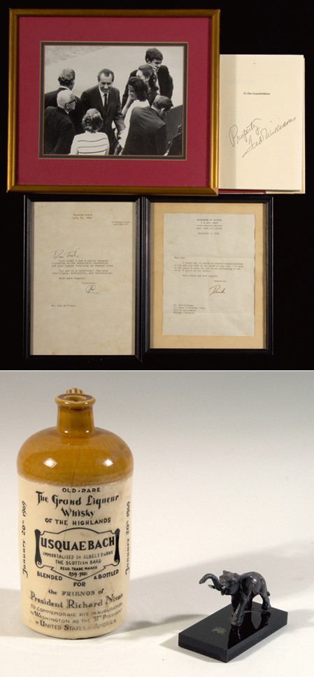 Description:Lot of President Richard Nixon materials with relation to Ted Williams c.1960-1980s. Includes 9/2/1968 typewritten letter on personal stationery as sent to Ted Williams in congratulations for the birth of his son. Framed and signed "Dick" in black ink, secretarial signed: EX; 7/18/1984 typewritten letter on personal stationery with comical content regarding Nixon watching Ted in a television interview. Hand inscribed "Dear Ted" and signed "RN" in black ink. Paper itself has some age toning, framed: EX; 1980 "The Real War" hard cover book by Richard Nixon autographed on the interior title page, "Property Ted Williams": EX; 1972 figural elephant statue with black onyx base having "1972 Campaigner" with Republican elephant logo: EX; Greeting card as sent to Williams from the President and Mrs. Nixon (unsigned): EX-MT; Framed black and white photograph of President Nixon with several individuals including Ted Williams' wife: EX-MT; Commemorative porcelain whiskey jug as given at the 1969 Presidential Inauguration. Titled at the bottom, "The Friends of President Richard Nixon to Commemorate his Inauguration January 20, 1969". Vertical hairline crack is present: VG-EX; and 1969 Presidential inaugural invitation and related ephemera: Range VG-NM. Includes auction LOA from JSA (autographs)