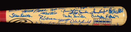 Description:Hall of Fame autographed bat with approximately (50) signatures. Rawlings "National Baseball Hall of Fame" logo bat has been signed throughout by approximately (50) Inductees including Koufax, Puckett, Rizzuto, Murray, Carew, Brett, Berra, Yount, Bench, Fisk, R.Jackson, and others. Blue marker signatures rate uniformly strong 8 to 9 out of 10. Year "2004" written on knob. Includes auction LOA from JSA and letter of provenance from Nita Killebrew: NM