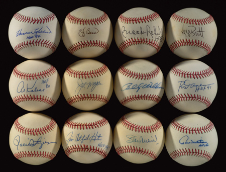 Description:Lot of (12) Hall of Fame single signed baseballs. Official American, National, or Major League baseballs, each signed on the sweetspot. Includes Brett, Molitor, Carew, B.Robinson, Killebrew, Berra, Hunter, Fingers, Musial, B.Williams, Morgan, and Kaline. (6) Have inscribed year of Induction. Ink signatures rate 7 to 9 out of 10; balls display varying levels of mostly minor scattered toning. Includes auction LOA from JSA and letter of provenance from Nita Killebrew: Range EX-NM