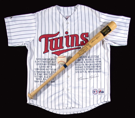 Description:Harmon Killebrew autographed stat jersey and bat with stat inscribed baseball. Includes Rawlings G.Budig OAL baseball signed on the sweetspot "Harmon Clayton Killebrew." Each panel has been inscribed with career related statistics (11 different) by Killebrew; Adirondack baseball bat with affixed careers stats placard, signed on the barrel "Harmon Killebrew"; and Majestic Twins jersey embroidered throughout the front with career stats, signed "Harmon Killebrew" below. Ink and marker signatures rate 8 to 9 out of 10. Ball has slightest hint of feathering to signature and extremely minor toning mentioned for accuracy; jersey has very small stain. Includes auction LOA from JSA and letter of provenance from Nita Killebrew: EX/MT-NM/MT