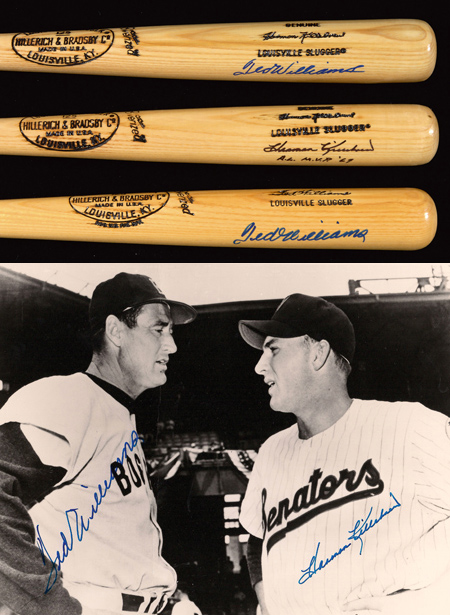 Description:Lot of (4) autographed pieces with relation to Harmon Killebrew and Ted Williams. Includes Ted Williams W166 signature model Louisville Slugger 125 baseball bat signed on the barrel, "Ted Williams"; Harmon Killebrew W166 signature model Louisville Slugger 125 baseball bat signed on the barrel, "Ted Williams."; Harmon Killebrew signature model Louisville Slugger 125 baseball bat signed on the barrel, "Harmon Killebrew A.L. MVP 69"; and 8"x10" black and white photograph, signed on the front by Williams and Killebrew (vertical crease through Williams image, sig. unaffected). Marker signatures rate 8 to 9 out of 10. Includes Ted Williams Museum COA for Williams signed W166 bat, auction LOA from JSA, and letter of provenance from Nita Killebrew: Bats NM-MT, Photo EX, Sigs. EX/MT-NM/MT