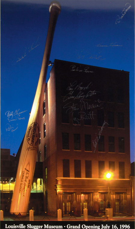 Description:Louisville Slugger Museum Grand Opening poster autographed by (13) mostly Hall of Famers. Large format poster has been signed in silver paint pen by (13) including T.Williams, Kiner, Killebrew, Doerr, Garvey, Reese, Brock, Slaughter, Musial, Brett, Banks, Yount, and Bobby Thomson. Signatures rate 8 to 9 out of 10. Hint of light wear evident through frame mentioned for the sake of accuracy. Framed to 28"x43" overall for display. Includes auction LOA from JSA and letter of provenance from Nita Killebrew: NM