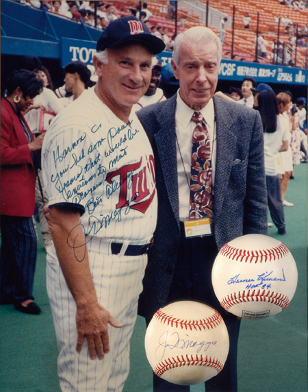 Description:Joe DiMaggio single signed baseball and signed photograph to Harmon Killebrew. Color 11"x14" photograph has been signed on the front, "Harmon, You had some power years that would be envious to most players - Best Always, Joe DiMaggio." Blue marker signature rates 8 out of 10. Framed to 15"x18" overall for display. Rawlings B.Brown OAL baseball signed on the sweetspot, "Joe DiMaggio" in blue ink rating 9 out of 10. Ball displays light scattered toning. Includes Hall of Fame logo baseball by Fotoball signed on the sweetspot by Killebrew in blue ink (8 out of 10), auction LOA from JSA, and letter of provenance from Nita Killebrew: Photo NM, Ball EX/MT