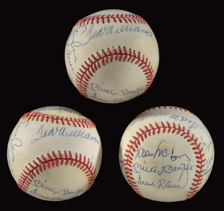 Description:Lot of (3) 500 Home Run Club autographed baseballs. Trio of Rawlings B.Giamatti Official National League baseballs with (2) signed by (11) 500 Homerun hitters including Mantle, Williams, Killebrew, Aaron, Mays, Schmidt, Jackson, Banks, F.Robinson, Mathews, and McCovey. Ink signatures rate 7 to 9 out of 10 with very slight imperfections affecting a small number of signatures. Third ball signed by (10) - missing Jackson - and having more substantial smudge. Moderate toning to all. Includes auction LOA from JSA and letter of provenance from Nita Killebrew: Overall EX/MT