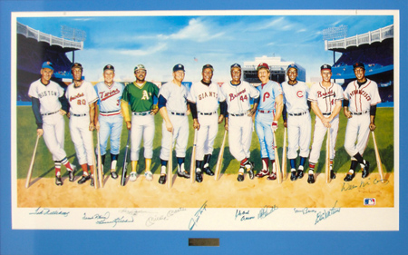 Description:500 Home Run Club autographed lithograph. Popular Ron Lewis artwork has been signed on the front by all (11) pictured including Mantle, Williams, Aaron, Mays, Banks, Killebrew, McCovey, Mathews, Schmidt, Jackson, and Robinson. Blue marker signatures rate 7/8 to 8 out of 10. Framed to 26.75"x41" for display with engraved placard inset detailing the date of signing. Includes auction LOA from JSA and letter of provenance from Nita Killebrew: EX/MT-NM