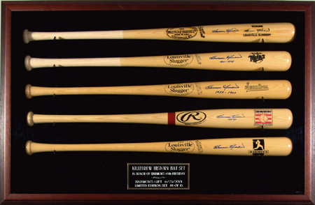 Description:"Harmon's Gift" limited edition set of (5) signed bats. Large 26"x29" shadowbox with inset placard noting that this is one of just (15) sets produced in honor of Killebrew's 65th birthday. Includes (4) different baseball bats (modern manufacture) relating to his career and fifth bat with "Harmon's Gift" logo. Each signed in marker rating 8 to 9 out of 10. Light wear to display. Includes auction LOA from JSA and letter of provenance from Nita Killebrew: Bats NM-MT, Display EX/MT
