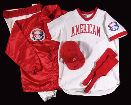 Description:Harmon Killebrew autographed Cracker Jack Old Timers uniform and windbreaker/jacket c.1989. Complete ensemble as issued to Killebrew for use in the famed annual Series. White jersey by Bike (size 46) has "American" team name lettered across the front and "Killebrew 3" on back. Includes matching pants (size 38), New Era size 7 1/4 hat (red with embroidered "A" on front), stirrup socks, and red Rawlings jacket with "Cracker Jack" logo on chest. Jersey, hat, and jacket have been signed in marker "Harmon Killebrew" rating 8 to 9 out of 10. Jersey and hat have additional "1989" inscriptions. Evident usage and wash wear throughout with small area of blemish to lower front of jersey. Includes auction LOA from JSA (autograph), LOA from Hunt Auctions (uniform), and letter of provenance from Nita Killebrew: EX