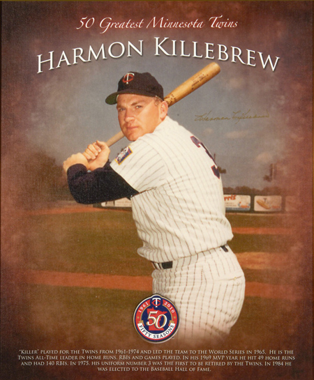 Description:Harmon Killebrew "50 Greatest Twins" presentational canvas print. One of a kind fine art giclee as commissioned by the Minnesota Twins specifically for Harmon Killebrew as a "token of appreciation" for his participation in their 50th Anniversary weekend and related festivities. Tastefully framed to 22.5"x26.25" overall for display and signed on the back "Personal Collection, Harmon Killebrew" in black marker rating 8/9 out of 10. Includes auction LOA from JSA, October 8, 2010 letter from the Minnesota Twins to Killebrew, and letter of provenance from Nita Killebrew: NM