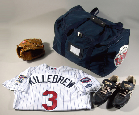 Description:2009 Harmon Killebrew Minnesota Twins professional model jersey with personally used glove, cleats, and travel bag c.2008-2009. Includes Twins home jersey by Majestic, tagged for the 2009 season with Metrodome and "Carl" (memorial) patches; Rawlings glove with "Pro-B" model designation having "#3" and "Kille" written on in black marker. Signed "Harmon Killebrew HOF 84" in black marker rating 9 out of 10; Reebok cleats, each signed in silver paint pen "Harmon Killebrew" and inscribed "Twins 2008 Spring Training"; and Minnesota Twins team logo travel bag with "3 Killebrew" identifier on either side. Moderate to heavy evident usage wear throughout. Signatures rate 7 to 8 out of 10. Includes auction LOA from JSA (autographs), LOA from Hunt Auctions, and letter of provenance from Nita Killebrew: Overall EX