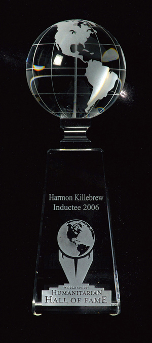 Description:2006 Harmon Killebrew World Sports Humanitarian Hall of Fame Induction presentational award. Beautifully rendered 9" crystal award piece featuring an angled base supporting globe. Lettered on the front, "Harmon Killebrew Inductee 2006" with "World Sports Humanitarian Hall of Fame" logo below. Includes newspaper from the following day picturing Killebrew speaking while holding the piece; paperwork regarding the ceremony; Killebrew's lapel pin; and Induction program signed on the front by Killebrew and fellow Inductees Steve Largent and Steve Smith. Includes letter of provenance from Nita Killebrew: NM