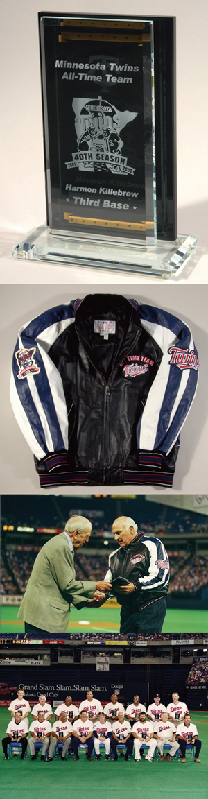 Description:2000 Harmon Killebrew Minnesota Twins All-Time Team award with related material. Finely crafted crystal award done in the style of those which were presented to members of the All-Century team. Presented to Harmon Killebrew by the Minnesota Twins for his selection to their All-Time Team. Two piece columnar award features an etched image of the "40th Season" logo with titling above and "Harmon Killebrew Third Base" below. 9" Tall. Includes Killebrew's All-Time Team leather jacket as worn when he received the trophy (autographed in the collar in silver paint pen rating 8 out of 10) and several photographs of Killebrew, et al on field during the ceremony with jacket and award. Auction LOA from JSA and letter of provenance from Nita Killebrew: NM